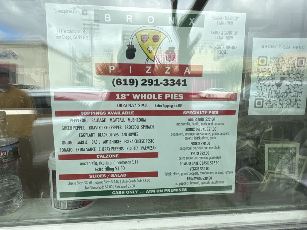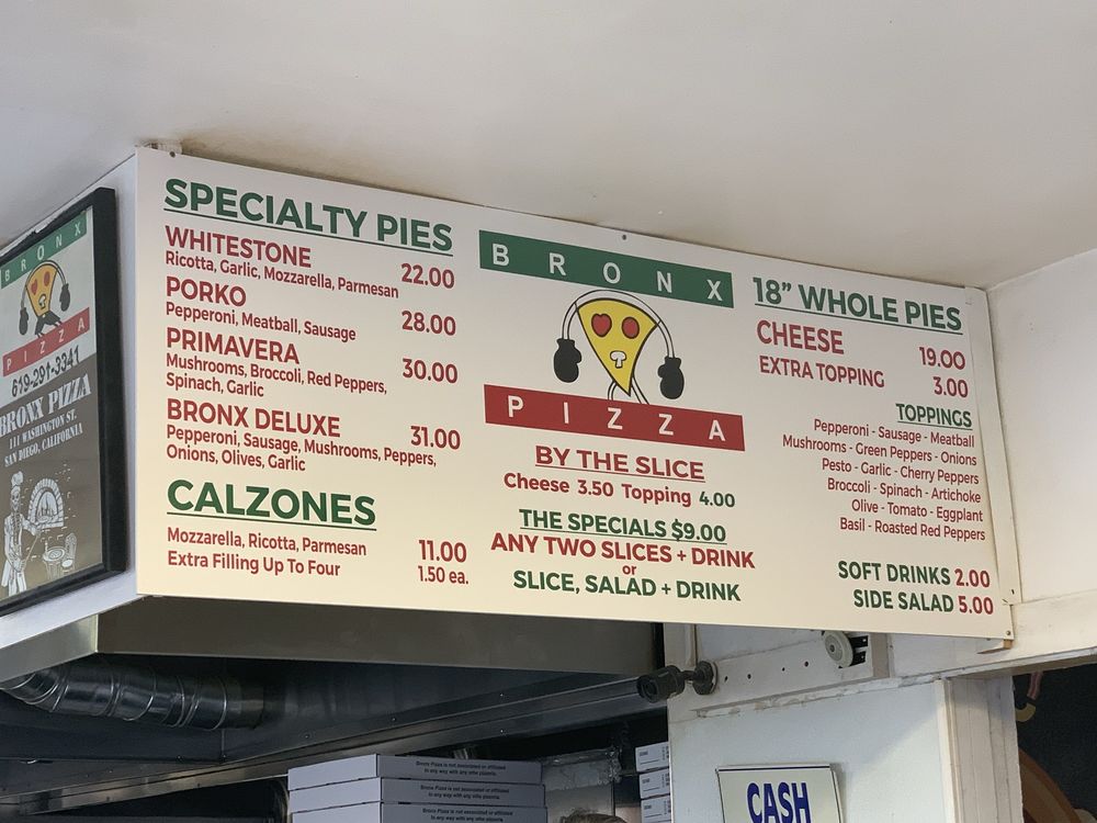 Introducing Bronx Pizza, a beloved pizza joint in San Diego known for its delicious thin-crust pies and vibrant atmosphere. Located at 111 Washington St, Bronx Pizza offers a variety of options, including vegan and vegetarian choices, with happy hour specials and plastic-free packaging. The menu features classics like Cheese and Pepperoni slices, as well as unique creations like the Whitestone and Porko pizzas. Customers rave about the flavorful sauce, crispy crust, and fast service. The cozy decor, New York subway theme, and friendly staff add to the overall dining experience. Make sure to bring cash as Bronx Pizza is cash-only. Whether you're a thin-crust lover or a pizza aficionado, Bronx Pizza is a must-visit for a satisfying slice of pizza.